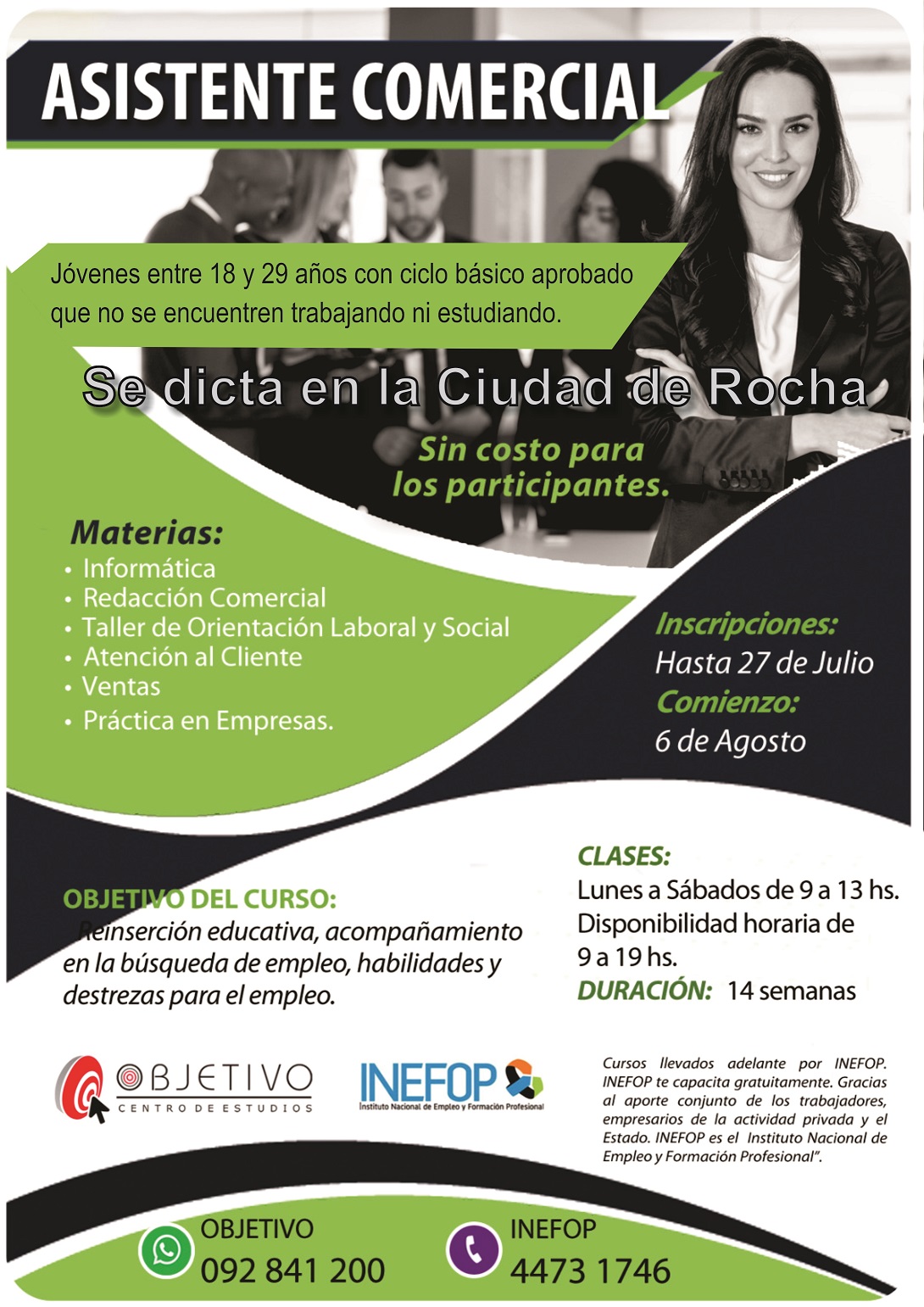 Dirigido a jóvenes de 18 a 29 años que tengan ciclo básico aprobado pero que no hayan finalizado 6to año de bachillerato. Que actualmente no estén estudiando ni trabajando.Se dictará en la ciudad de Rocha, sin costo para los participantes.Clases: de lunes a sábado de 9:00 a 13:00 horasInicio: 6 de AgostoInscripciones hasta el 27 de julio en INEFOPo por http://www.objetivo.edu.uy/des-curso.php?id=31o al cel 092841200 o 44731746